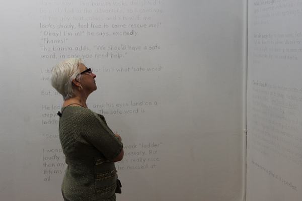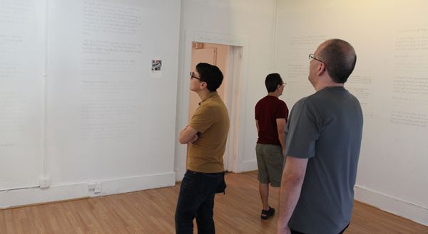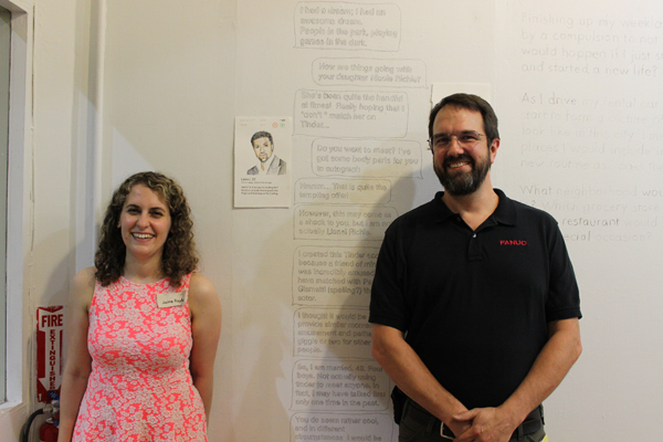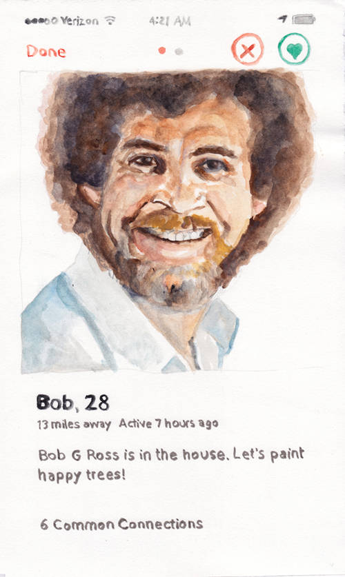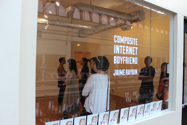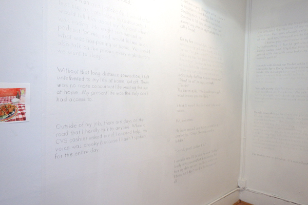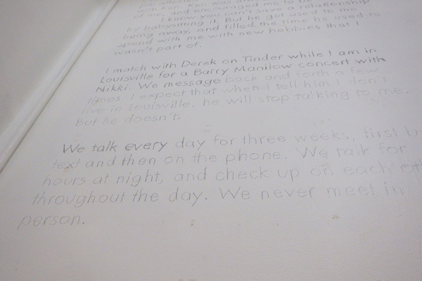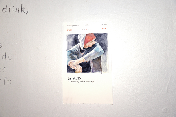 After an eleven-year relationship ends, Jaime Raybin downloads a dating app. The work in her show, “Composite Internet Boyfriend,” is an autobiographical narrative that includes personal writing (handwritten directly on the gallery walls), and watercolor illustrations.