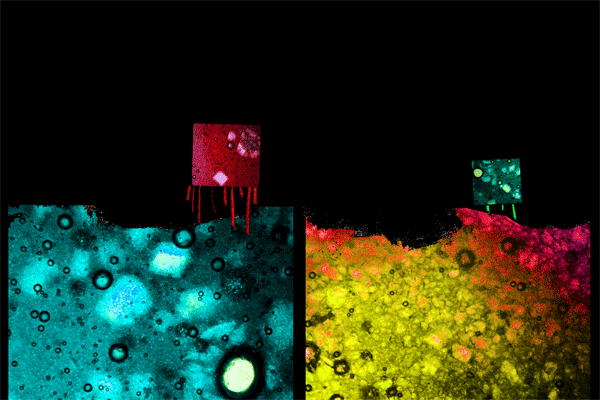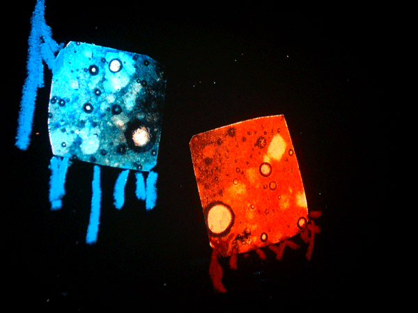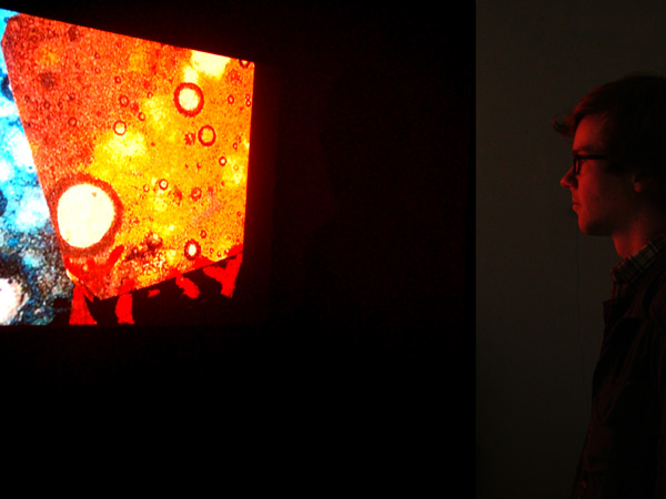 I made sequential images with microscope collages and exported them to 35mm slides. The slides are projected as a series of narrative vignettes, mimicking a stop-motion animation within the academic presentation of a slide carousel projection.
